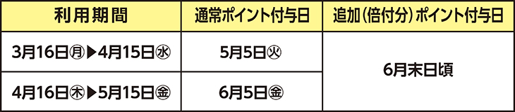 ![]() (例)3月20日(金)に1,000円(税込)ご利用の場合5ポイントが5月5日(火)、20ポイントが6月末頃に付与されます。 |