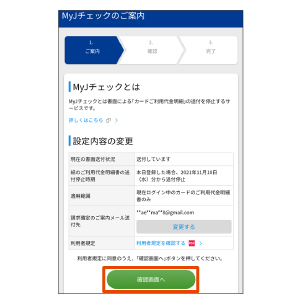 - MyJチェックにご登録後も、お客様のご利用内容等により「カードご利用代金明細書」を郵送させていただく場合がございます。